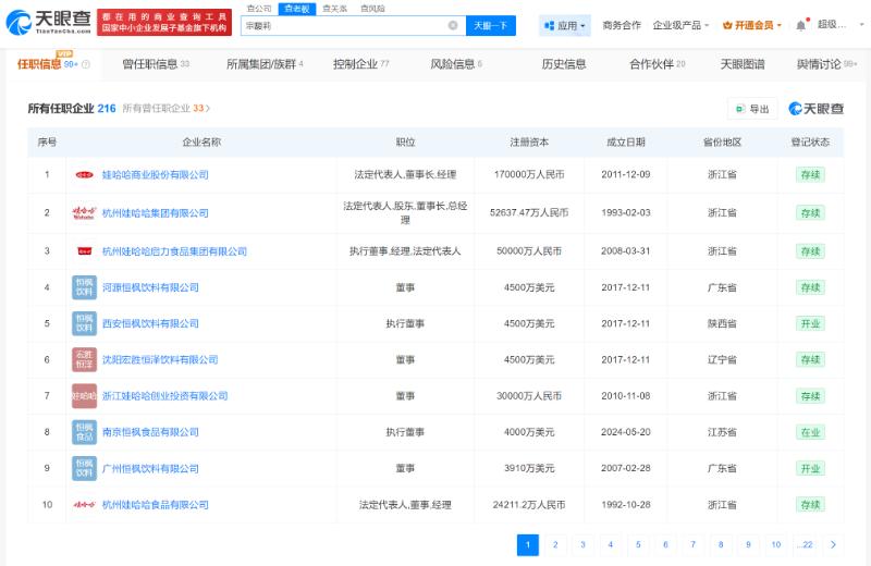 同时,宗馥莉名下关联210余家企业,其中200余家为存续或开业状态,包括娃哈哈商业股份有限公司、杭州娃哈哈集团有限公司、杭州娃哈哈集团有限公司等金智股配,宗馥莉在上述企业中分别担任董事长、总经理等职务,并持有10余家企业股份。