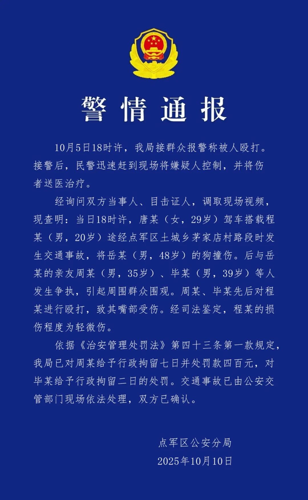 国荣配资 湖北宜昌警方:女子驾车撞伤狗后友人被殴打,两名打人者被拘留